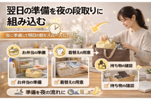 夜の家事の一部として準備を組み込むことで、作業をまとめて進められるようになり、全体の流れを整理しやすくなります。